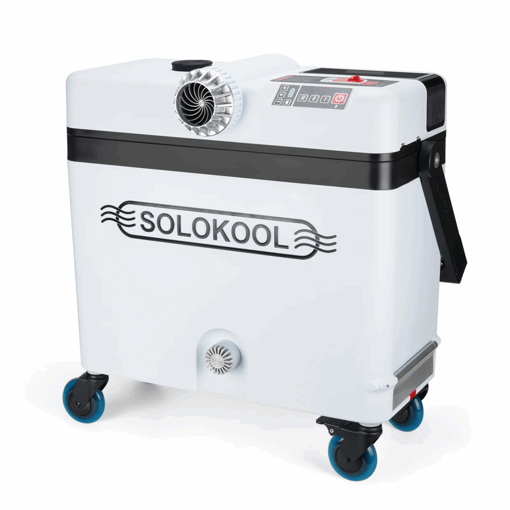 SoloKool positions the Model V as a 2-in-1 personal A/C device and cooler that uses ice to chill an internal Kold Plate with heat-exchange fins. The brand states that it is not a swamp/evaporative cooler, but rather an A/C that produces dry cold air. Battery power supports portable use, and certain models add speakers for music.
