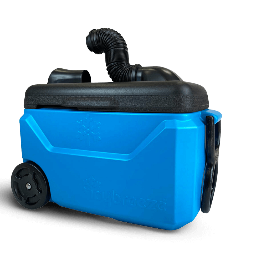 IcyBreeze offers a wheeled ice chest that also pushes cooled air through a vent or flexible hose. It uses a patented heat-exchange system powered by ice and water to deliver air up to 35°F cooler than ambient. It also offers a 3-speed fan and optional battery power for portable use.